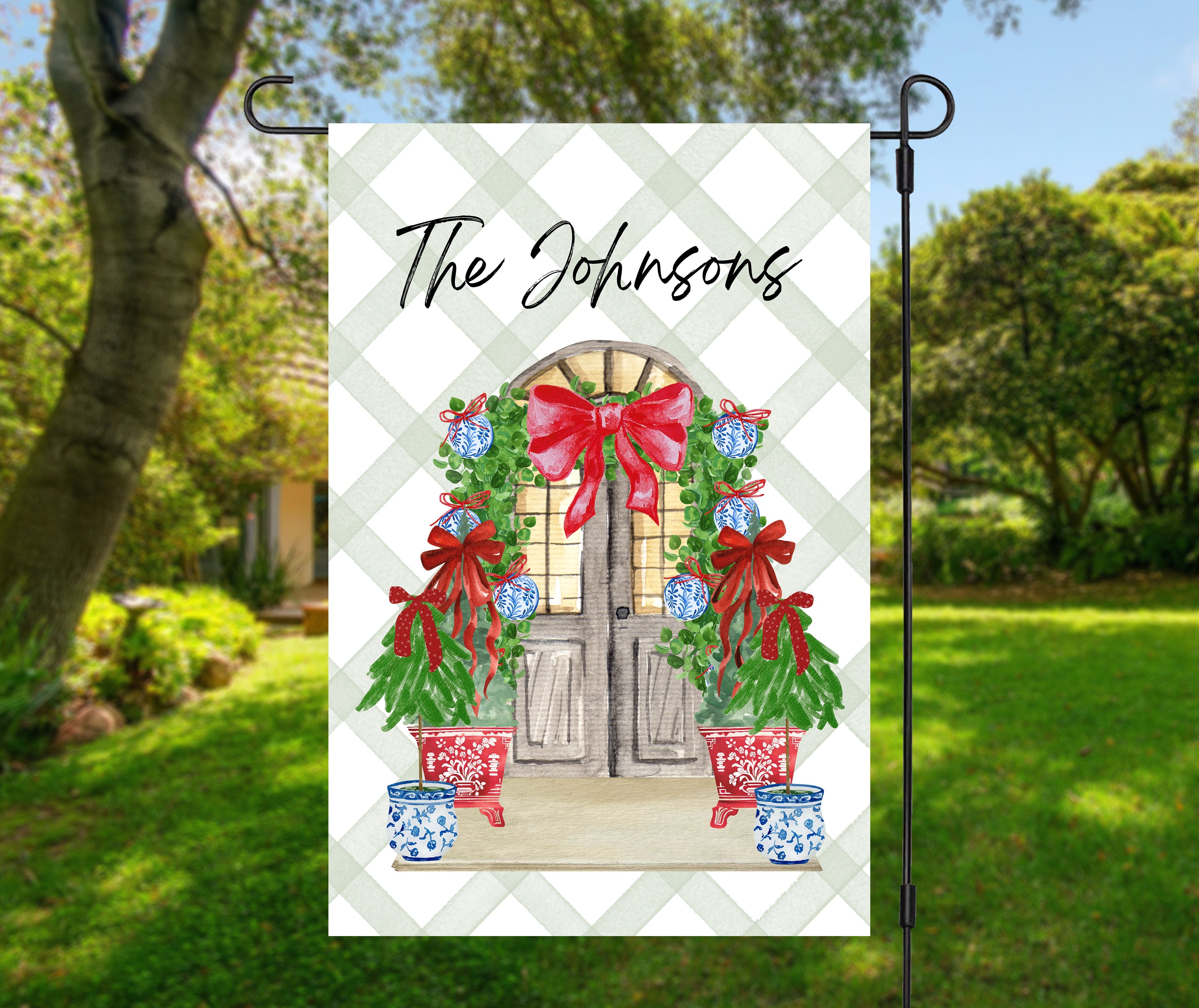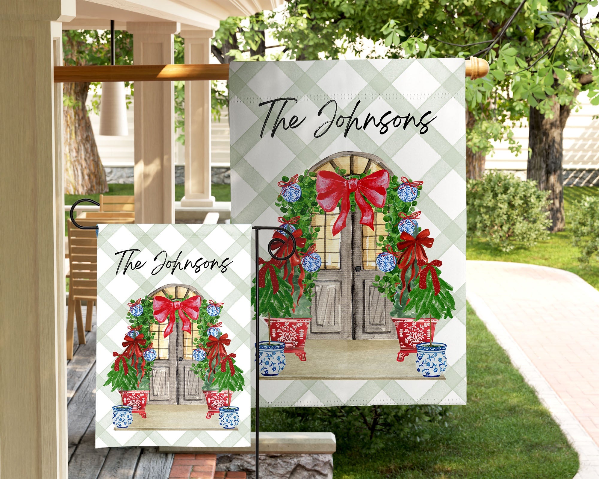 Personalized Christmas Door Garden Flag – Custom Holiday Yard Décor with Red Bows and Chinoiserie Planters