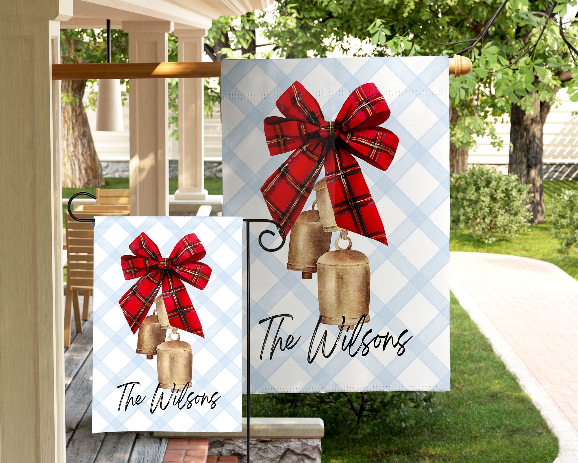 Personalized Christmas Bell Garden Flag – Custom Holiday Yard Décor with Red Plaid Bow